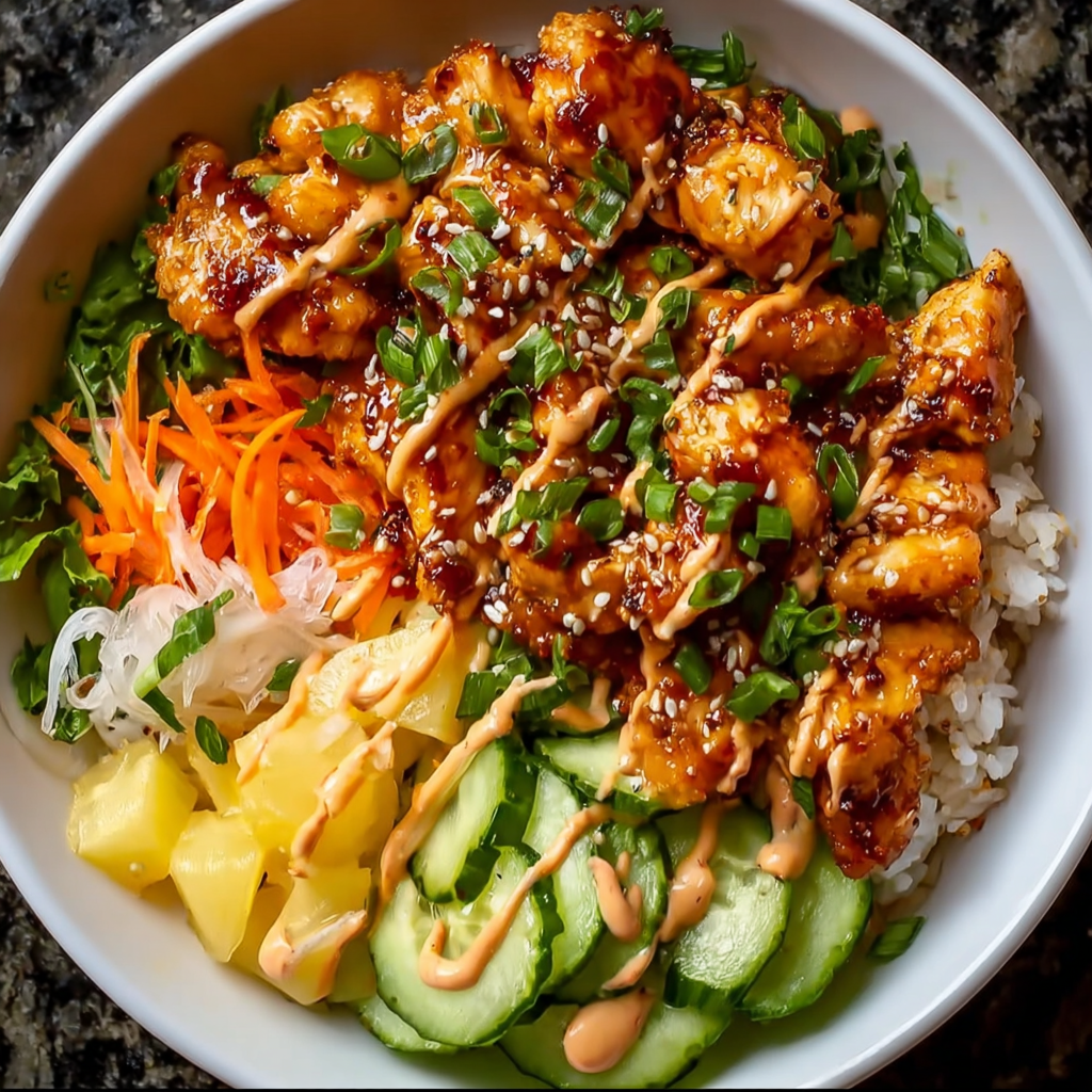 This bowl is not just tasty, but it’s also balanced and nourishing. The chicken gives you a solid protein boost, which helps keep you energized and full for longer. The mix of crunchy vegetables like cucumber, carrots, and cabbage adds fiber and important vitamins that support digestion and immunity. Leafy greens like kale or spinach bring in antioxidants and minerals, which are great for your skin and overall health. Plus, using a bit of sriracha in the sauce adds a spicy kick that can help speed up your metabolism. Honestly, it’s a meal that feels both comforting and good for your body.