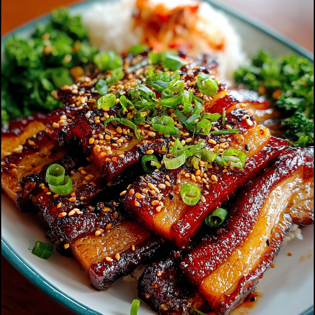 - Transfer the pork belly to a serving plate, sprinkle generously with sliced green onions and toasted sesame seeds for a fresh crunch and nutty flavor.