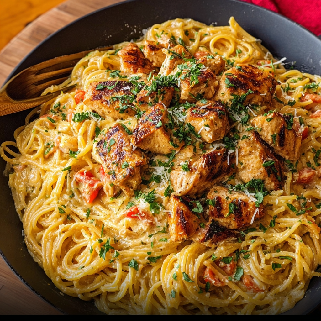 - Return the cooked chicken to the skillet, add chopped parsley or cilantro, then add the cooked spaghetti. Toss everything together gently to coat the pasta and chicken evenly with the creamy Cajun sauce.