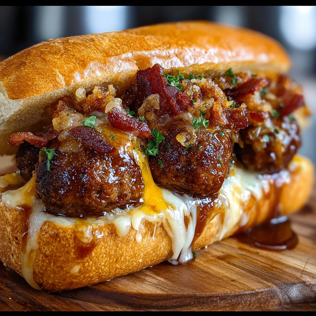- Build your meatball sandwiches: layer shredded cheese inside each roll, add 3-4 meatballs, then top with crispy bacon slices and fresh parsley.
