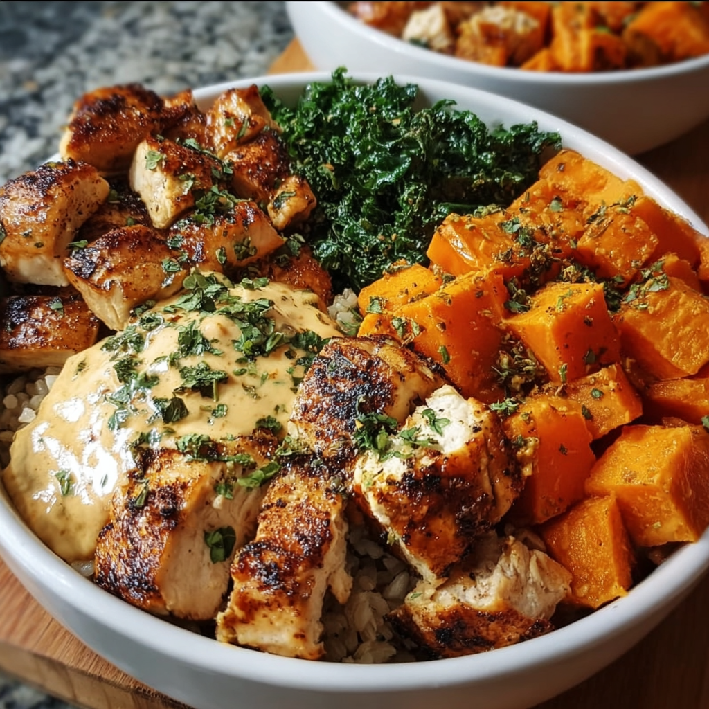 This bowl is one of those dishes where every ingredient feels like it belongs, and the flavors just work so well together. I especially like how the roasting brings out a natural sweetness in the sweet potatoes, while the chicken adds that savory kick. The kale gives it a fresh, slightly bitter note that balances things perfectly, and the sauce? It’s the little magic touch that ties it all up in a neat, delicious package.