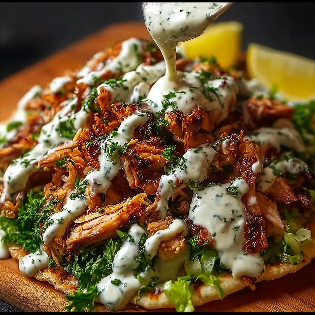 - Pile on the shredded chicken shawarma.
