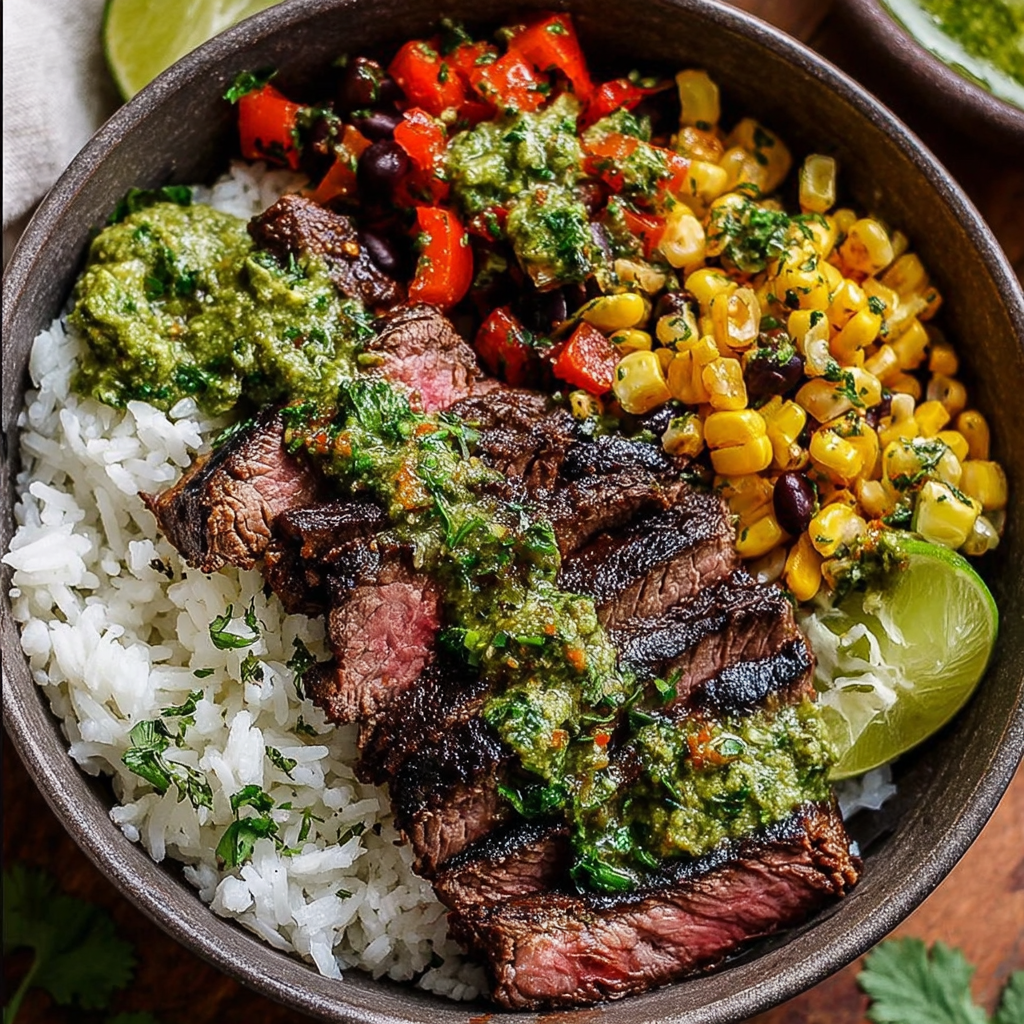 This recipe brings together tender grilled steak with fluffy cilantro lime rice, slightly charred fresh corn, and a zesty black bean pepper salsa. Then the magic happens with a creamy cilantro lime sauce drizzled on top that ties everything together beautifully.