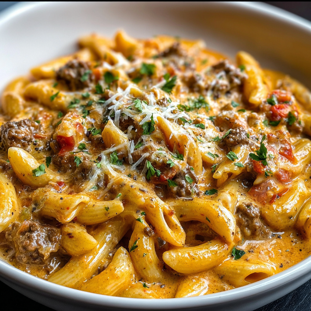 - Serve your creamy beef pasta hot, garnished with freshly chopped parsley and a generous sprinkle of Parmesan cheese. Enjoy!