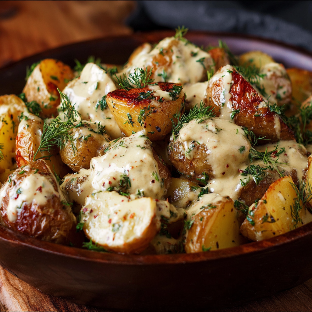 - Once the potatoes are roasted, transfer them to a large bowl, pour the creamy sauce on top, and toss gently to make sure each piece is coated.