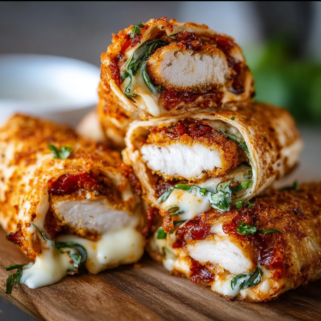 - Prepare Your Wraps: While the chicken cooks, lay out your tortilla wraps. On each wrap, place a few slices of mozzarella cheese, a handful of fresh spinach, and some chopped sun-dried tomatoes. Then, add the crispy chicken strips on top.