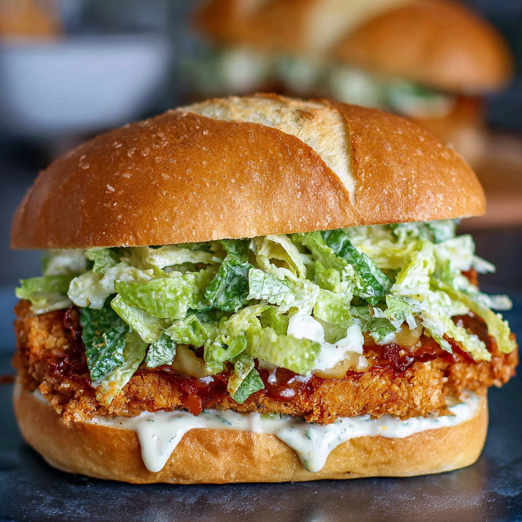 - Assemble the Sandwich: Spread a generous layer of Caesar dressing on the bottom bun. Add the fried chicken, then if you want, sprinkle bacon bits or drizzle bacon jam over the top. Add the dressed Romaine lettuce, then crown with the top bun.