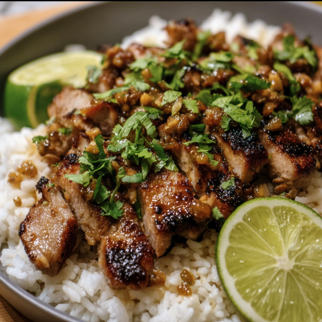 - Serve the juicy pork over a bed of your creamy coconut rice, topped with a sprinkle of fresh cilantro, some chopped peanuts if you like that crunch, and lime slices on the side for an extra squeeze of freshness.