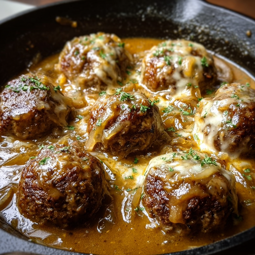- Finish It Up: When the meatballs are done baking, add them to the skillet with the onion sauce, gently stirring to coat them. If you like, sprinkle shredded Gruyère cheese on top and cover the skillet until the cheese is melted, about 3-5 minutes.