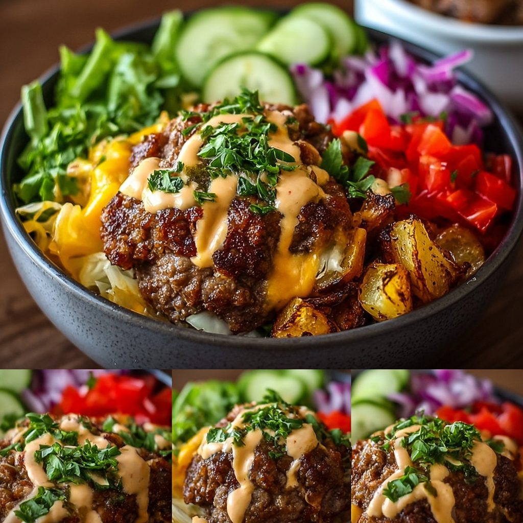 If you’re like me, sometimes you want the classic flavors of a burger but prefer something lighter and packed with veggies. That’s exactly what this high-protein burger bowl is all about! It’s full of juicy ground beef, melty cheese, crunchy fresh veggies, and crispy roasted potatoes—all in one bowl, topped with a creamy, flavorful sauce. Trust me, this hearty bowl is perfect for lunch or dinner when you want something satisfying but fresh.