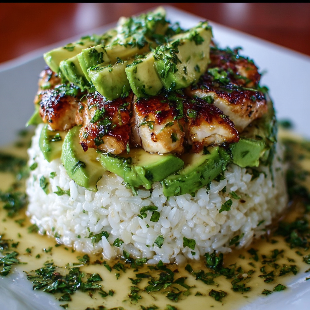 - Build Your Stack: Arrange the glazed chicken pieces atop the rice base, then layer slices of creamy avocado right on top.