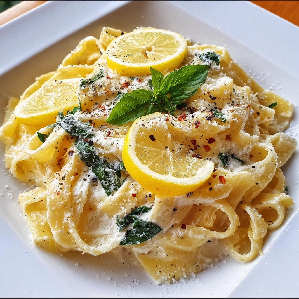 - Serve: Plate up the pasta, and finish with a generous sprinkle of grated Parmesan cheese, fresh basil leaves, and some extra lemon slices على الجوانب for a pop of color!