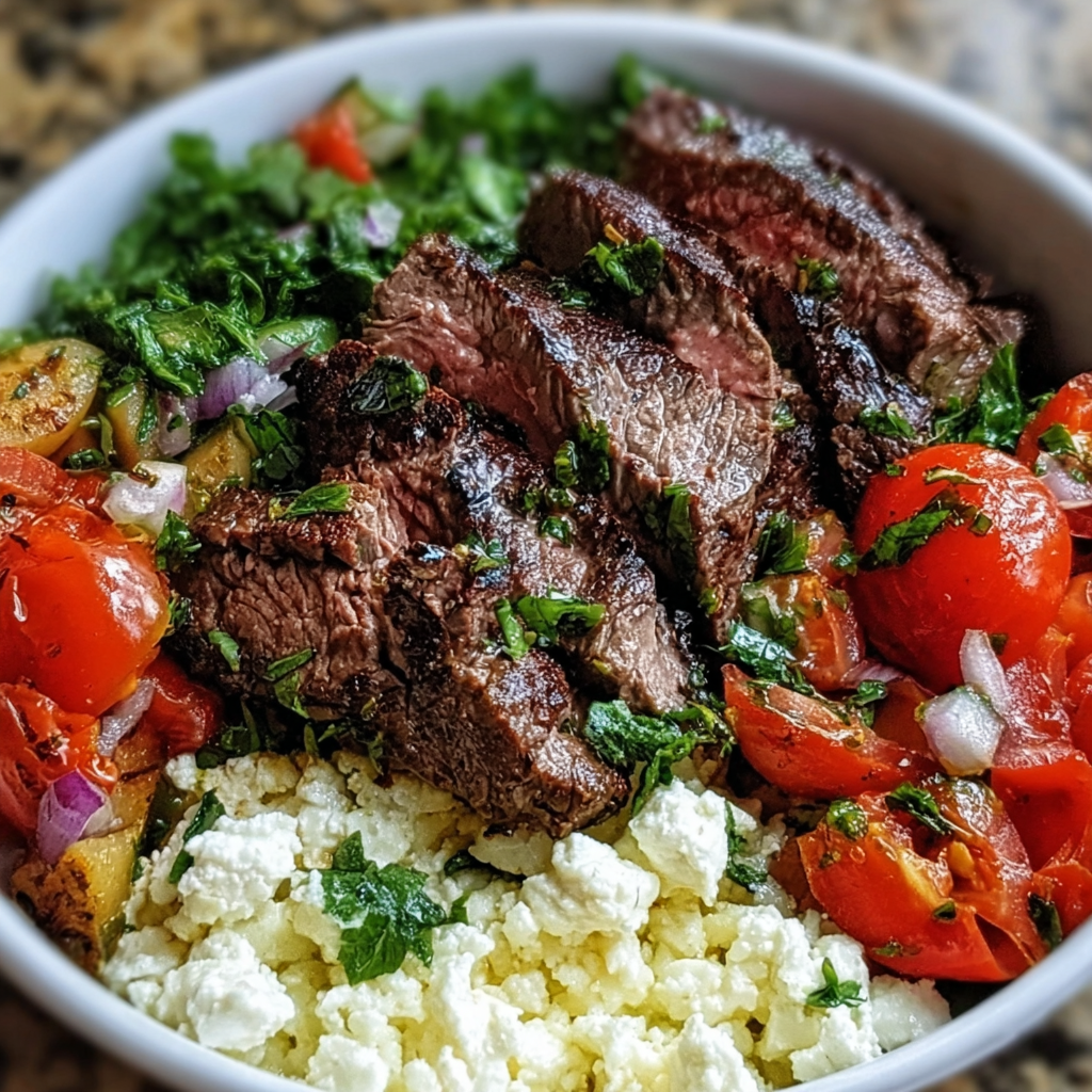 This steak bowl is not just good for the taste buds; it’s also great for your body! The flank steak provides a powerful protein punch, which is essential for muscle building and recovery. The quinoa is a fantastic source of complete protein and fiber, helping you feel full longer. And let’s not forget those vibrant veggies! Cherry tomatoes, zucchini, and red onions add antioxidants and vitamins that are key to a balanced diet. Adding feta cheese brings in a bit of calcium, making this bowl a well-rounded meal you can feel good about!