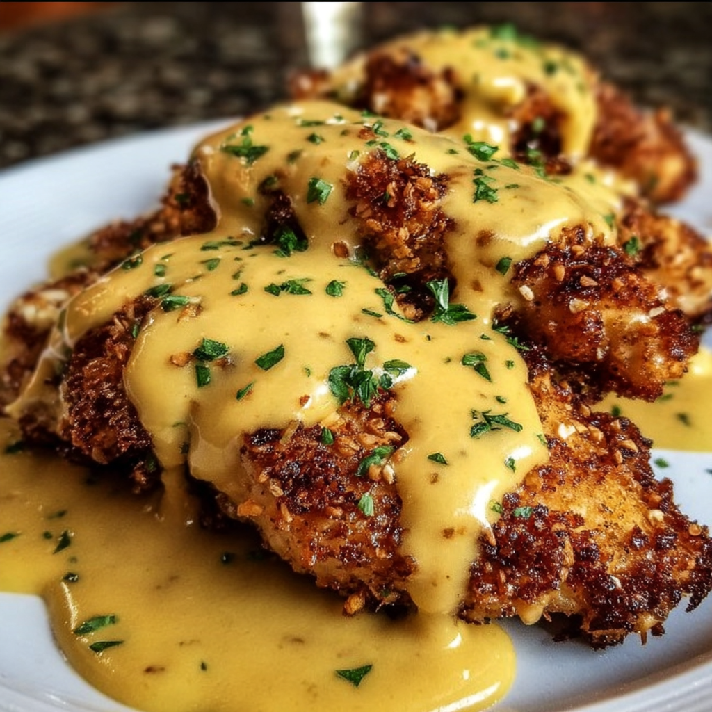 - Pour the creamy mustard cheddar sauce over your crispy pretzel chicken.