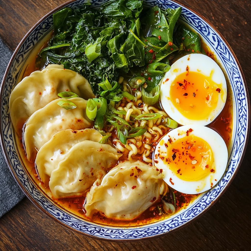 - Assemble the Bowl: This is where it all comes together! Divide your cooked ramen noodles into serving bowls. Now, ladle that steaming hot broth over the noodles. Place the pan-fried dumplings on one side, the wilted greens on the other, and don’t forget to add those beautifully halved soft-boiled eggs right in the center!