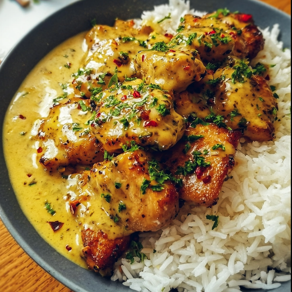 - Serviere das Hähnchen heiß auf einem Bett von Reis und genieße es!